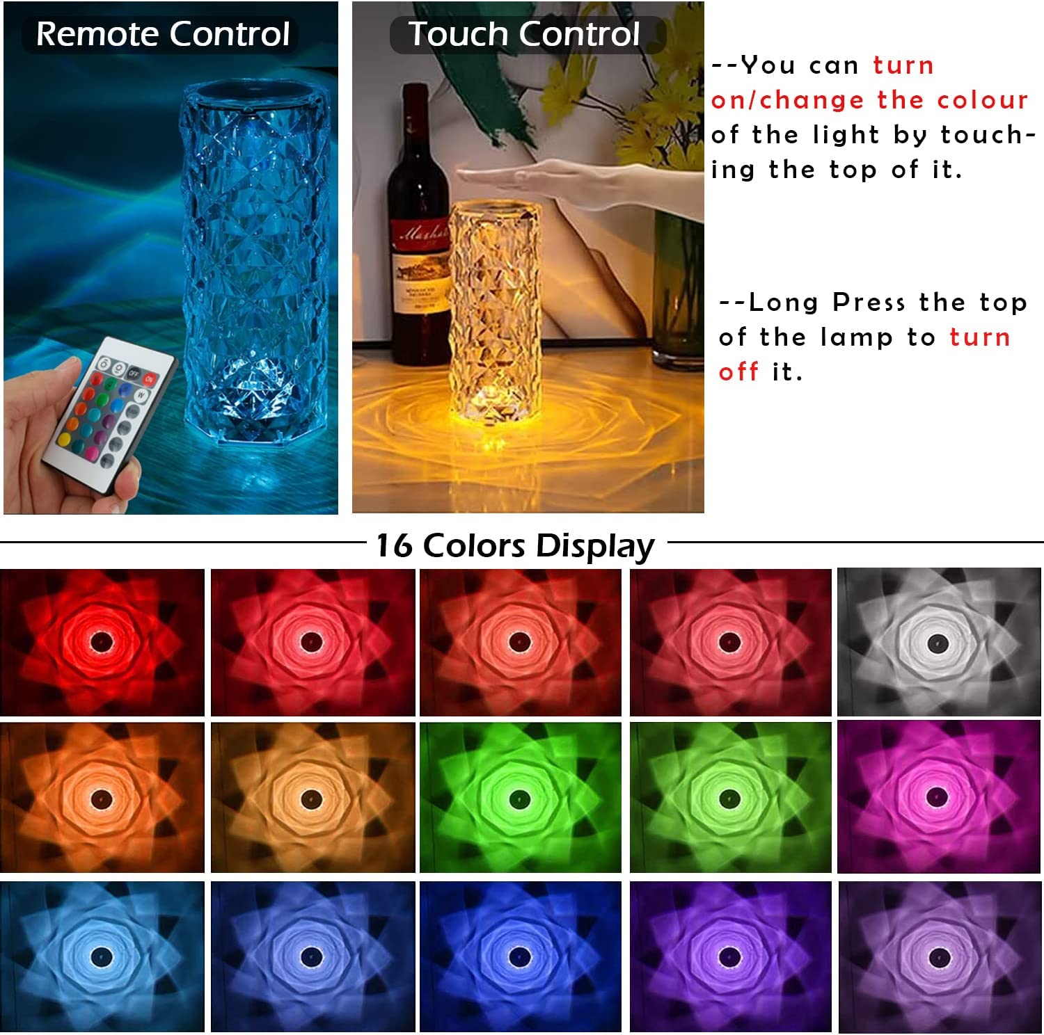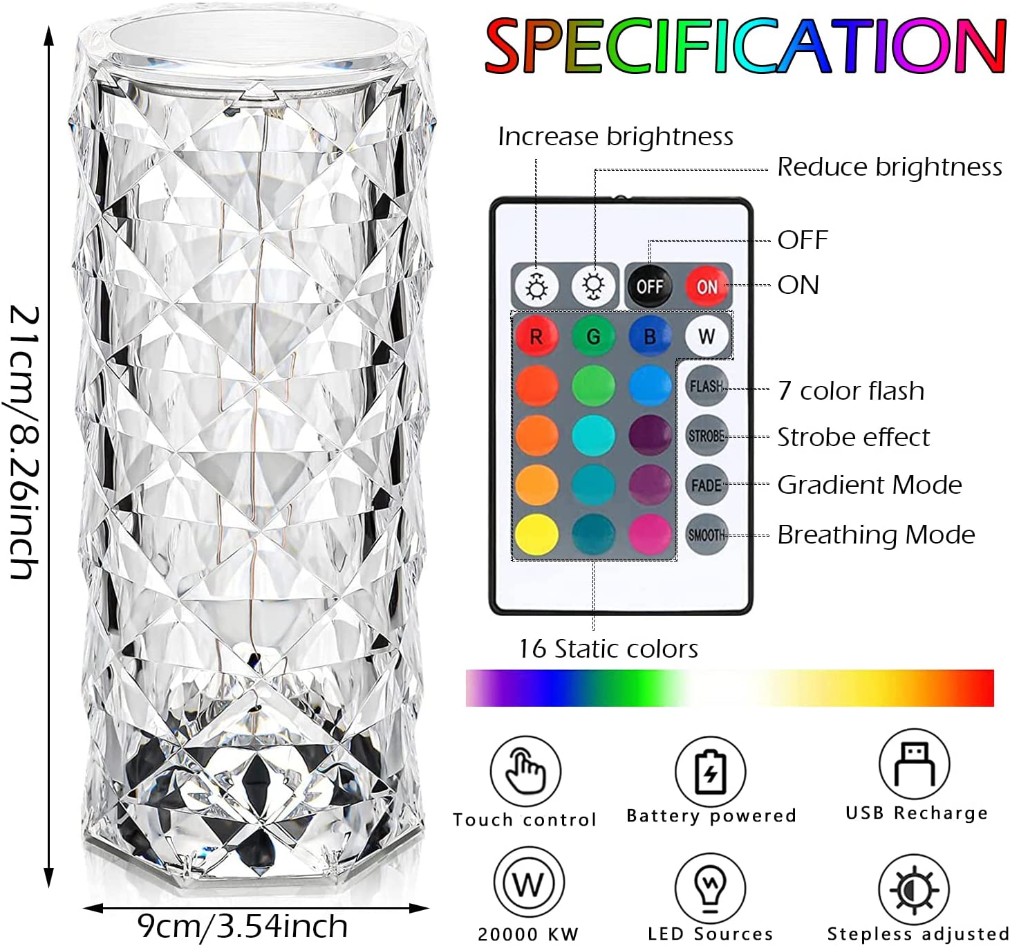 - Both Tactile & Remote Control Switch: This crystal diamond lamp equipped with a remote control, which can control the change of 16 colors, 4 lighting modes and 3 levels of brightness–25%/75%/100%. You can also touch the top of the lamp to turn/off and adjust the color of the light. Ideal for Bedside Tables.